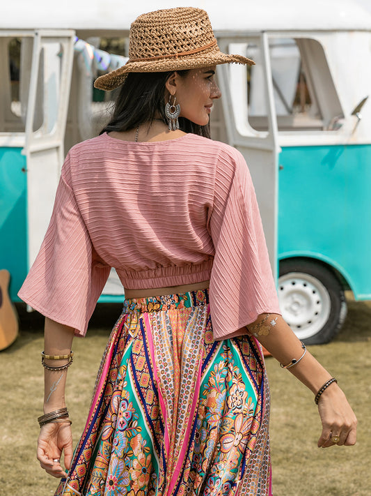 Twisted Smocked Flare Sleeve Cropped Top